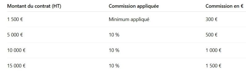Du 1er au 6e mois suivant la mise en relation : commission de 10 % du montant HT de la prestation conclue (plafond minimum de 300€ HT)